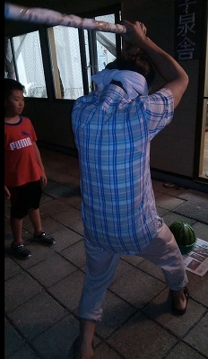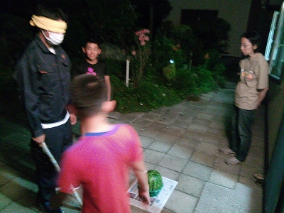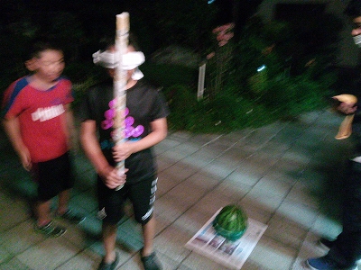 スイカ割りは、みんながきちんとスイカに命中できました。大きなスイカを、おなかいっぱい食べました。